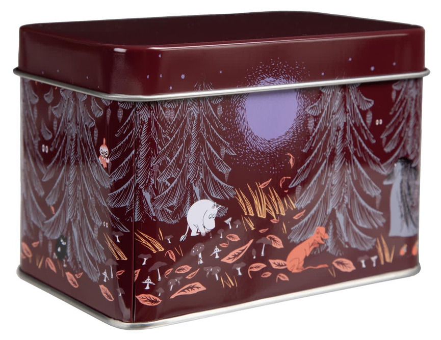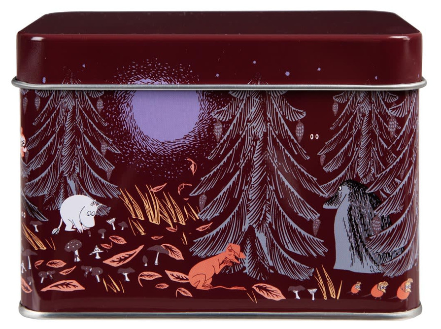 En vacker plåtburk i djupt vinröd nyans med det stämningsfulla Urskog-motivet. Här vandrar Mumintrollet och hans vänner genom den stilla skogen under månskenet – en bild av lugn och harmoni.