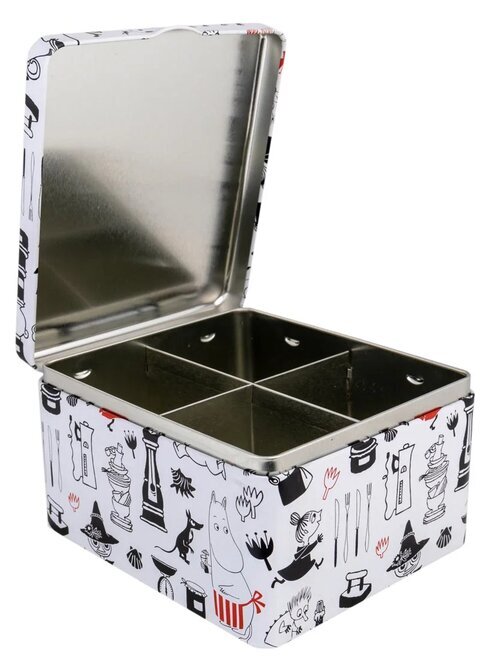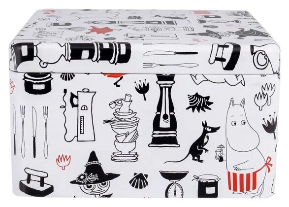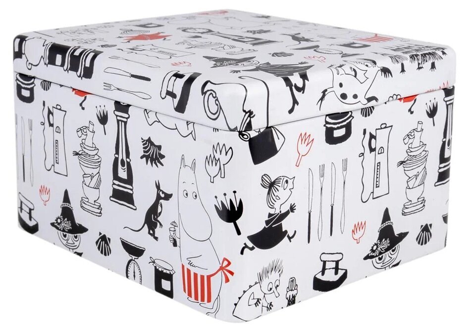 Teburk med svartvitt muminmotiv med inslag av röda detaljer. Plåtburken har lufttätt lock & spännlås. Läs mer