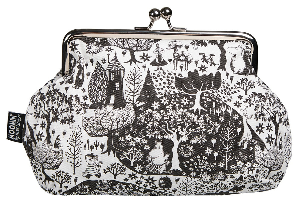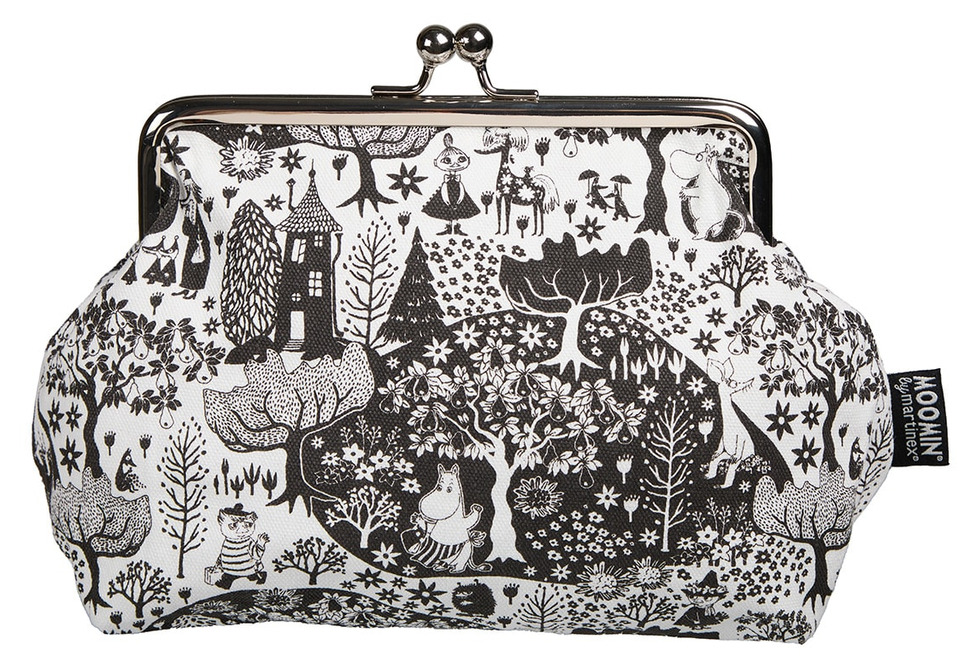 Denna vackra väska är som en sagobok i miniformat – full av liv, med Mumindalens älskade figurer i ett detaljrikt svartvitt motiv. Den rymliga formen gör den perfekt för småsaker som du vill ha samlade och nära till hands, mynt, mobil, glasögon, pennor eller kort. Det klassiska metallspännet ger ett nostalgiskt uttryck och håller innehållet säkert på plats.