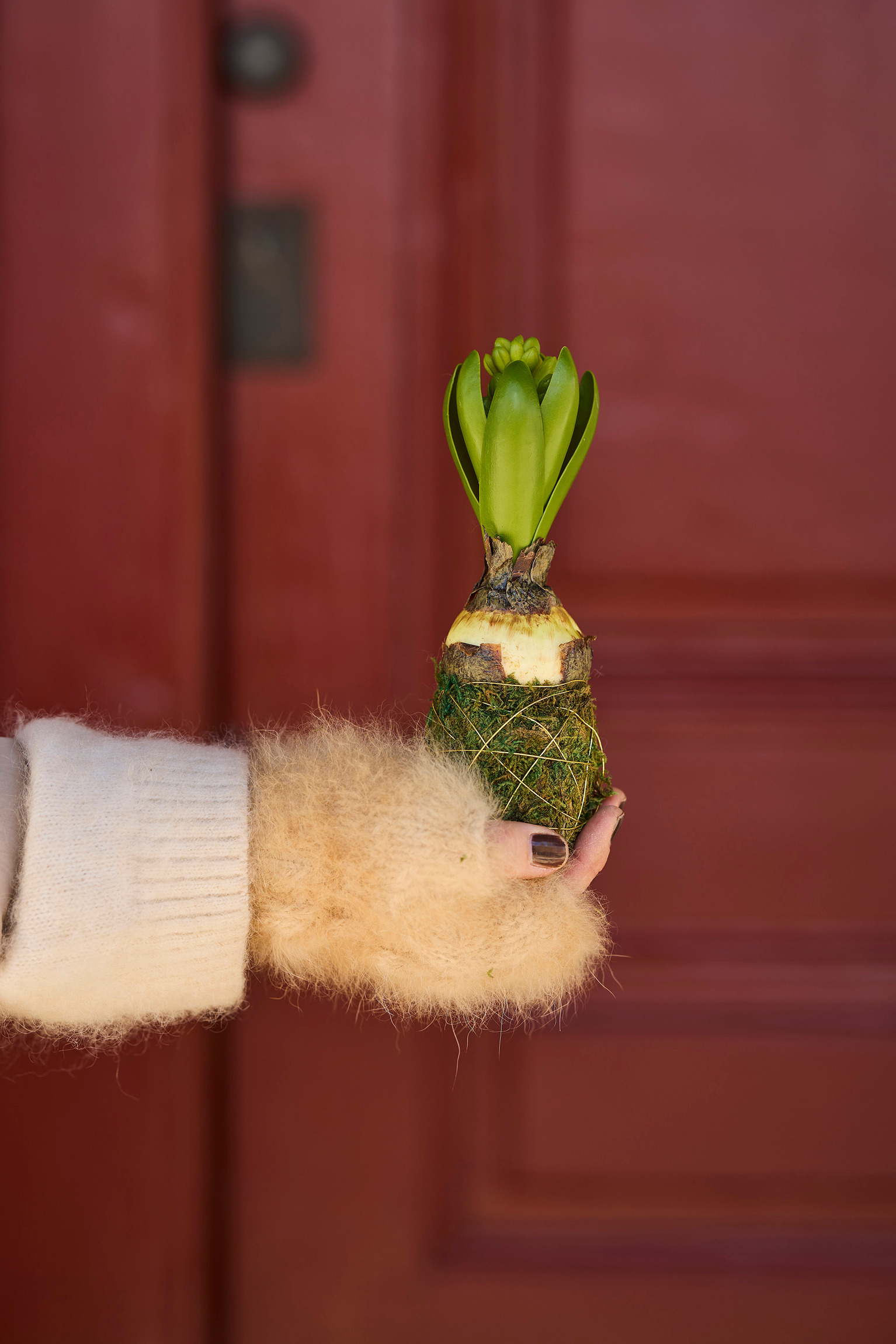 I bilden finns en hand som håller en hyacint omsorgsfullt täckt med mossa, och produkten kommer från varumärket Mr Plant. I bakgrunden syns en dörr med en dämpad röd färg. Dörrens yta har en slät finish med några paneldetaljer, vilket ger en känsla av djup och dimension. Handens hud är täckt av en vante i ljus och mjuk ulltextur som framhäver en varm och ombonad känsla.