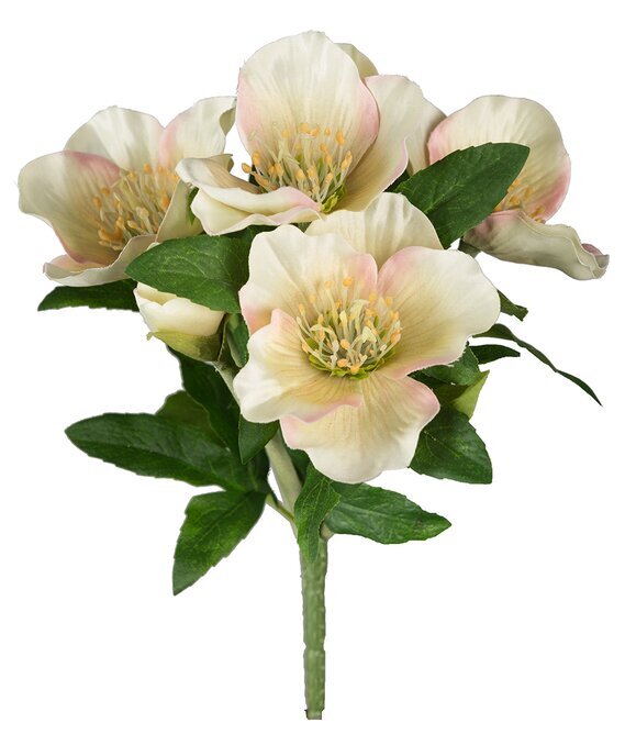 De delikata kronbladen omringar en mitt med gula ståndare som skapar en intressant kontrast mot den ljusa basfärgen. Bladen är gröna och realistiskt utformade, vilket förstärker den naturtrogna känslan i buketten och ger en fin inramning runt blommorna. De bladiga stjälkarna ser robusta ut och håller blommorna stadigt, vilket gör att buketten kan placeras enkelt och hållbart i en vas.