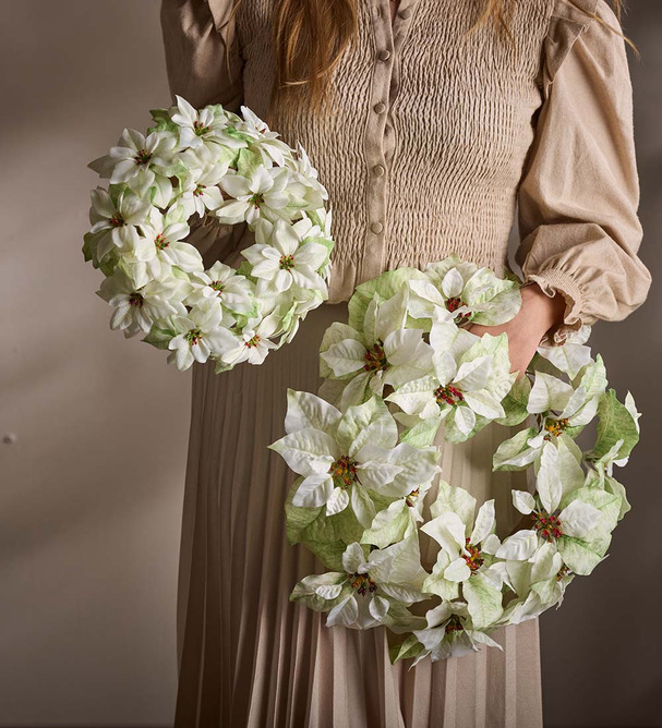 En vacker konstgjord krans fylld med vita julstjärnor som sprider julstämning. Perfekt att hänga på dörren, väggen eller som mittpunkt i en bordsdekoration. De naturtrogna blommorna håller sig lika fina år efter år – utan att vissna eller tappa färg. En tidlös julfavorit som skapar en varm och välkomnande känsla i hemmet.