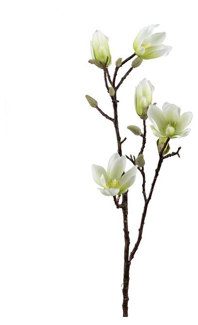 Bakgrunden är enkel och vit, vilket gör att magnoliakvisten framträder tydligt. Detta gör den ideal för användning i en mängd olika dekorativa sammanhang, såsom arrangemang i vas eller som en del av en större blomsterkomposition. Den distinkta formen och färgpaletten gör den lätt att kombinera med andra konstväxter eller möbler, vilket ger en flexibilitet och mångsidighet som uppskattas av många kunder.