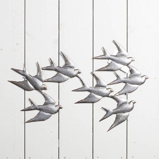 Metallen fåglarna är gjorda i har en dämpad, silverskimrande ton som fångar ljuset och skapar subtila skuggor runt omkring. Varje fågel är formad med noggranna konturer där vingarnas spetsar och kroppens böjning återges naturtroget, vilket förstärker känslan av rörelse och frihet.