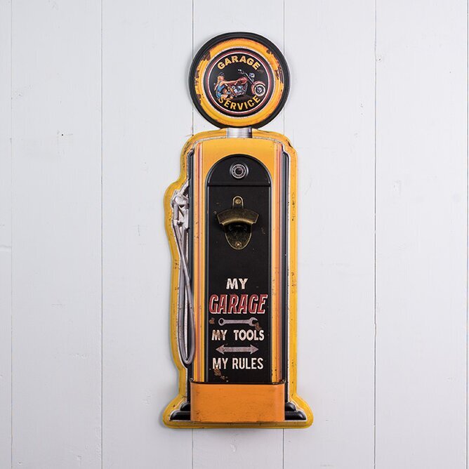 Färgschemat domineras av en klargul nyans som utgör basen för bensinpumpsdesignen. Centralt placerad, finner man själva kapsylöppnaren i form av en detalj i metall, vars blanka yta står i kontrast mot den mörkare bakgrunden. Ovanför öppnaren har bensinpumpen texten "Garage Service" inskriven, flankerad av detaljerade illustrationer av verktyg.