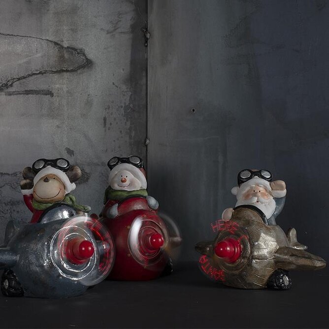 Till vänster om snögubben är en annan figur i en liknande lekfull pose. Denna figur, också klädd i en innebördsprevant dräkt, sitter i ett silverfärgat flygplan. Propellern framstår som aktiv, fångar rörelsen och ger liv åt bilden. Figuren har också pilotglasögon och ser ut att vara redo för ett äventyr. Den metalliska färgen på planen reflekterar ljuset på ett sätt som betonar de bekanta och nostalgiska tonerna av gammaldags leksaker.