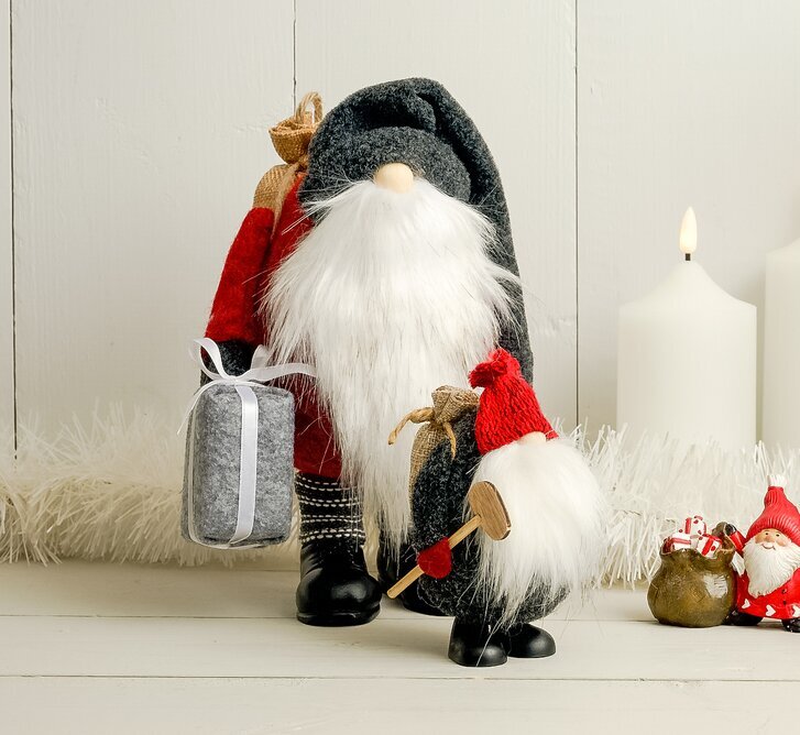 Dekorativ tomte med paket & ryggsäck, en fin detalj i fönster eller på sidobord. Finns i flera storlekar. Läs mer