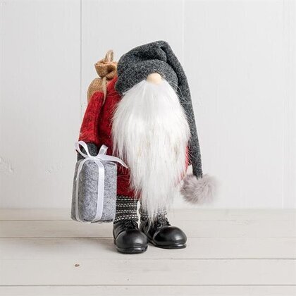 På huvudet bär tomten en lång, grå mössa som hänger nonchalant över axeln. Mössan är prydd med en plyschboll i änden, vilket förstärker den traditionella känslan av en klassisk juldekoration.