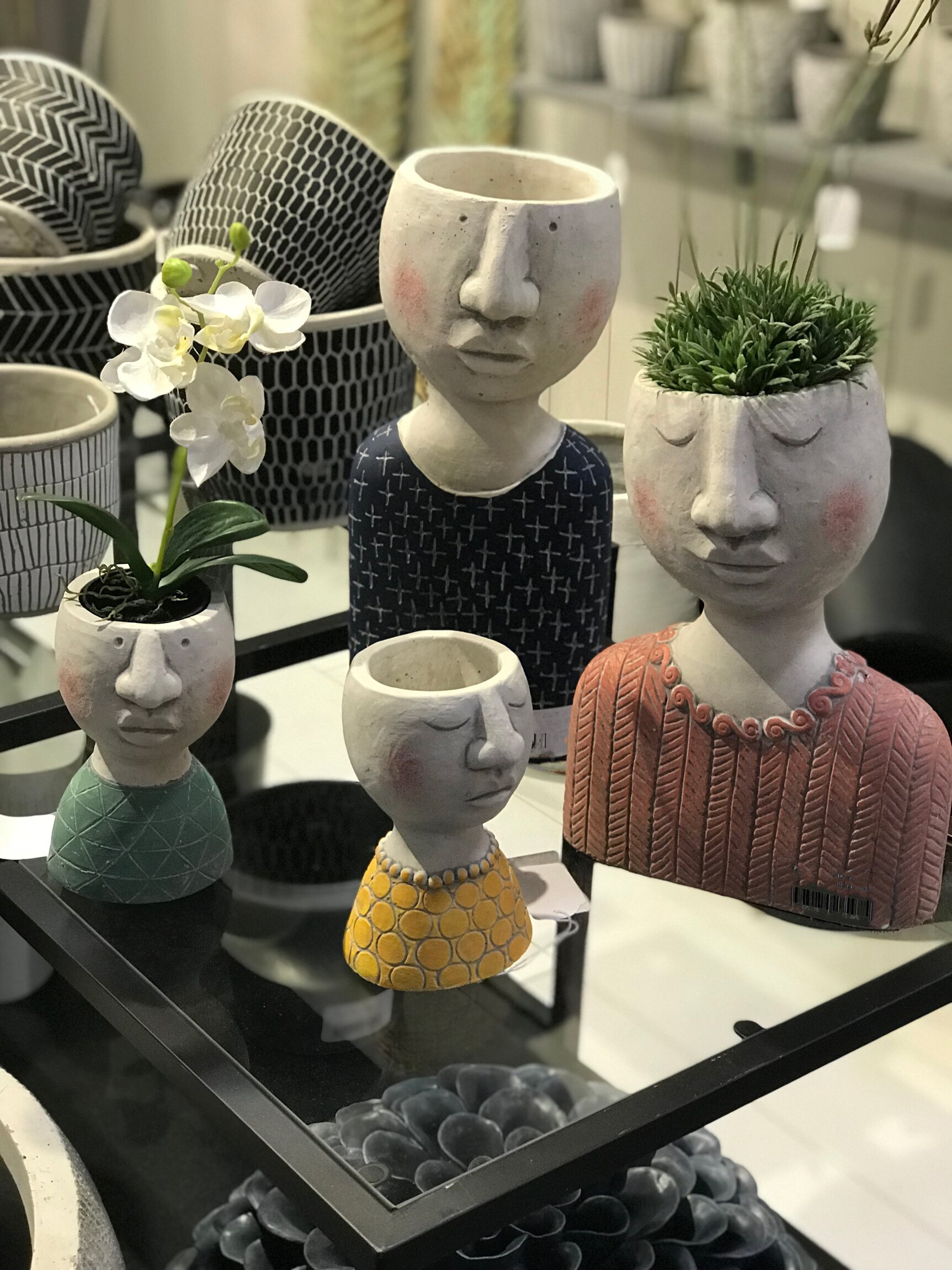 Till höger om dessa, fångar en annan kruka uppmärksamheten med en frodig grön växt som verkar frodas. Dess ansikte har en stiliserad och kanske drömsk uppsyn, och dess klädsel är prydd med ett mönster som liknar stickat tyg, i en varmare terrakotta-röd nyans.