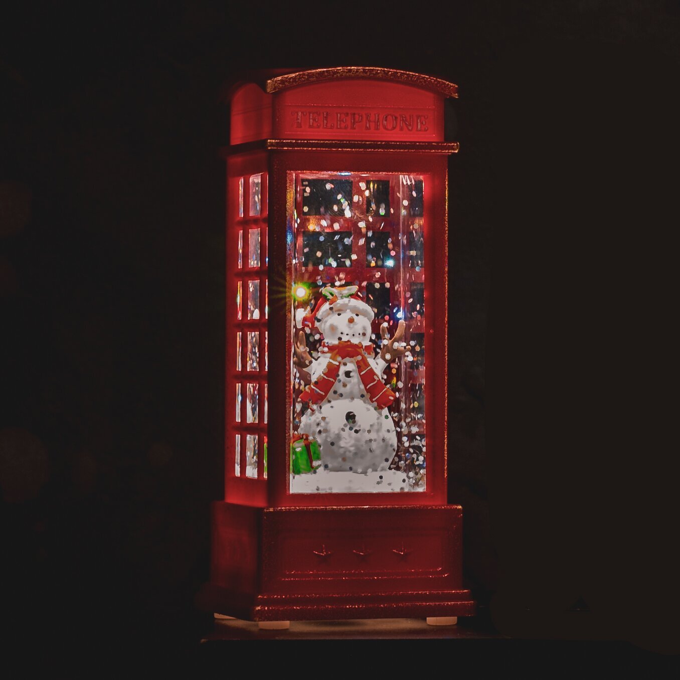 Dekorativ snöglob i form av en engelsk telefonkiosk med snögubbe, LED-belysning som ger snögloben en stämningsfull belysning när snöflingorna glittrar. Batterier medföljer ej.