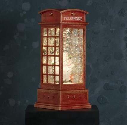 På bilden ser vi en vackert utformad snöglob från Multi Agentur som fångar betraktarens intresse med sin originella design. Det är en modell av en klassisk telefonkiosk, vilket ger en nostalgisk känsla och för tankarna tillbaka till en tid då sådana kiosker var en vanlig syn i stadsmiljöer. Telefonkiosken är röd och har en sirlig finish som framhäver dess detaljer. Ordet "TELEPHONE" är tydligt ingraverat över dörröppningen, vilket understryker den traditionella karaktären hos dessa ikoniska byggnader.