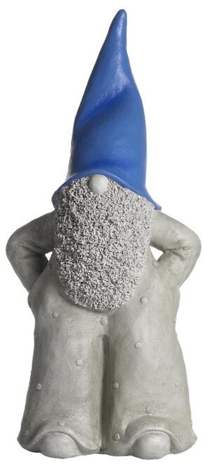 Figuren föreställer en tomte med imponerande detaljer. Den mest slående aspekten är den höga, spetsiga hatten i en klar blå färg som omedelbart drar blickarna till sig. Hatten tycks vara varsamt formad och ger ett livfullt intryck mot den i övrigt något dämpade färgskalan. Under hatten syns ingen synlig kropp, utan den stora, buskiga skägget täcker hela ansiktet och ger tomten dess karakteristiska utseende. Skägget har en intressant struktur, nästan som om det är gjort av små, tätt sammanfogade flingor eller knottror, vilket skapar en intressant kontrast mot de slätare ytorna.