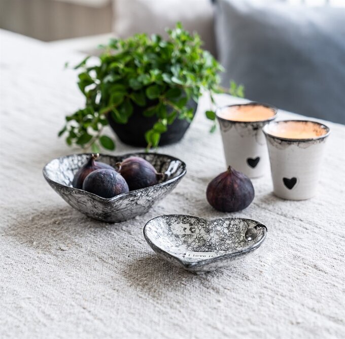 Hjärtformad skål med text - I love it samt metallhänge med signatur. Skålen passar fint både till servering & dekoration. Läs mer