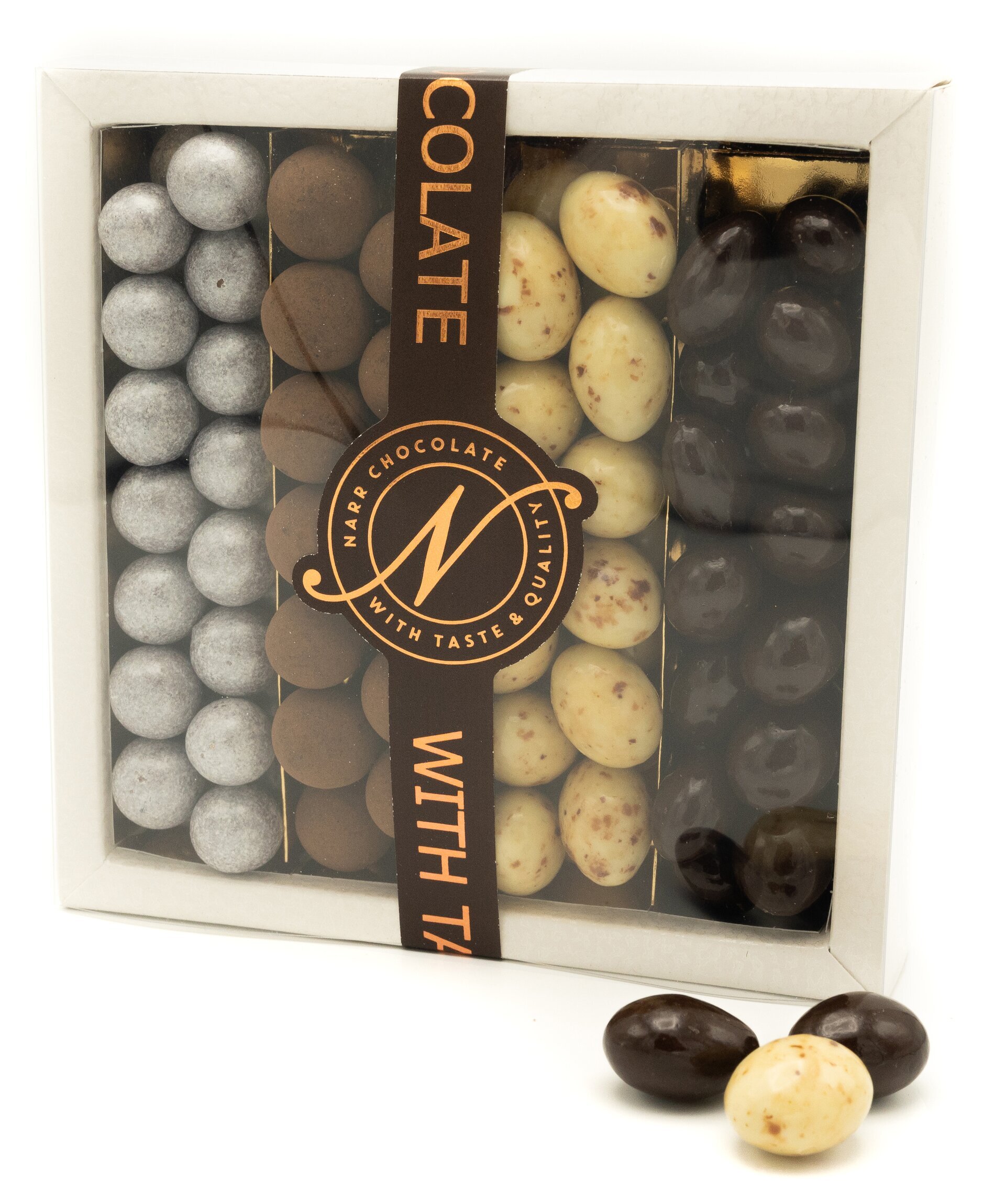 Hasselnötter dragerade med mjölkchoklad, mörk choklad, kaffe och kakaopulver.