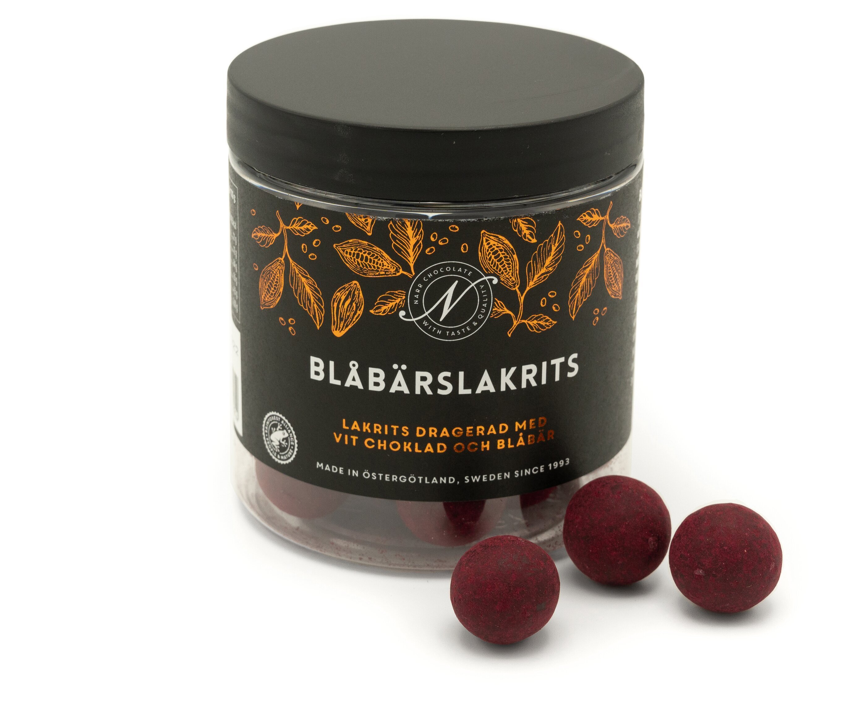 Blåbärslakrits - Lakrits dragerad med vit choklad och blåbär. Nettovikt: 150 g. Läs mer