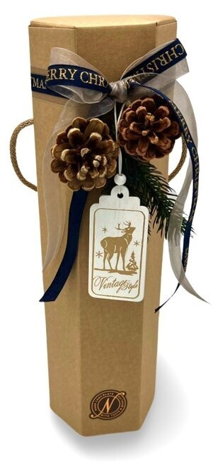 En rektangulär etikett hänger nedåt från bandet, bärande en tryckt bild av en ren bredvid en dekorerad gran. Under illustrationen finns texten "Vintage Style" vilket betonar den gamla tidens charm och estetiska tilltal. Etiketten är i en ljus färg med en mörkare design, vilket ger en stilren kontrast mot den bruna kartongen.