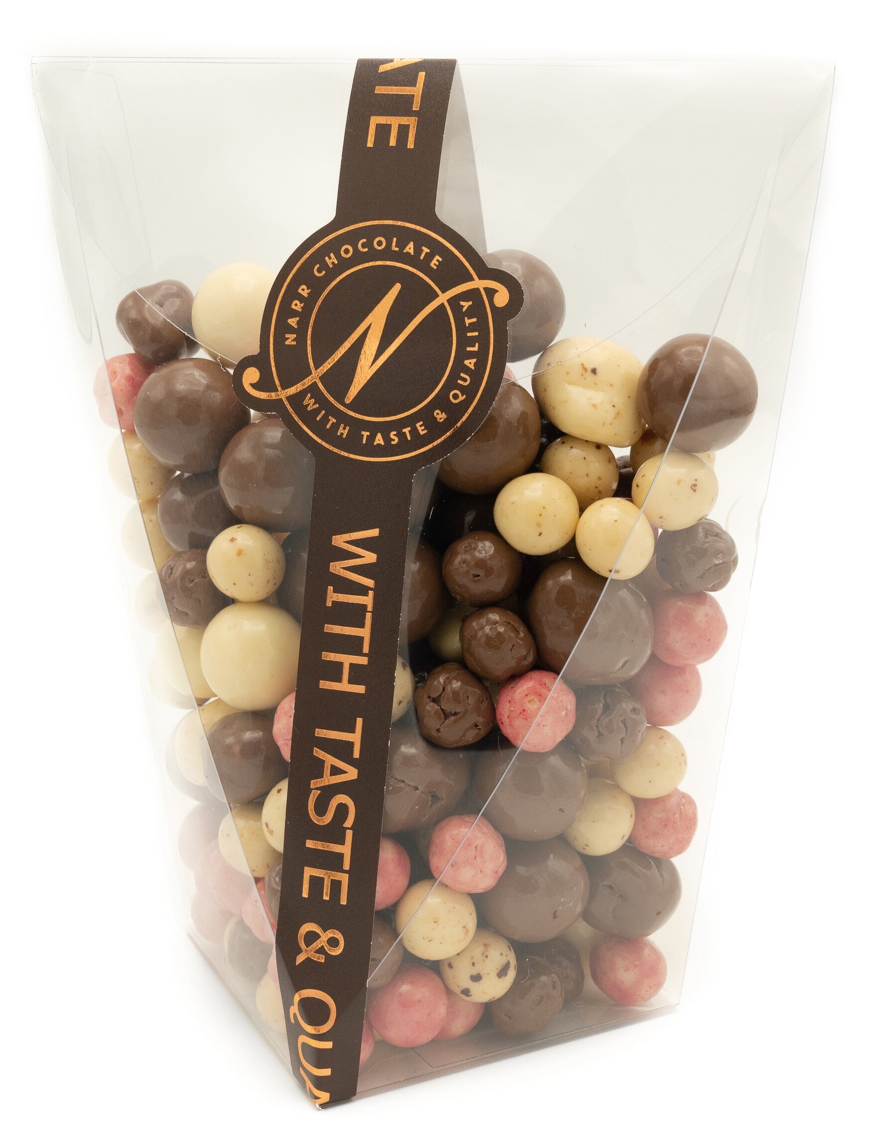 En mix av härligt krispiga majs- och maltkulor dragerade i choklad.
