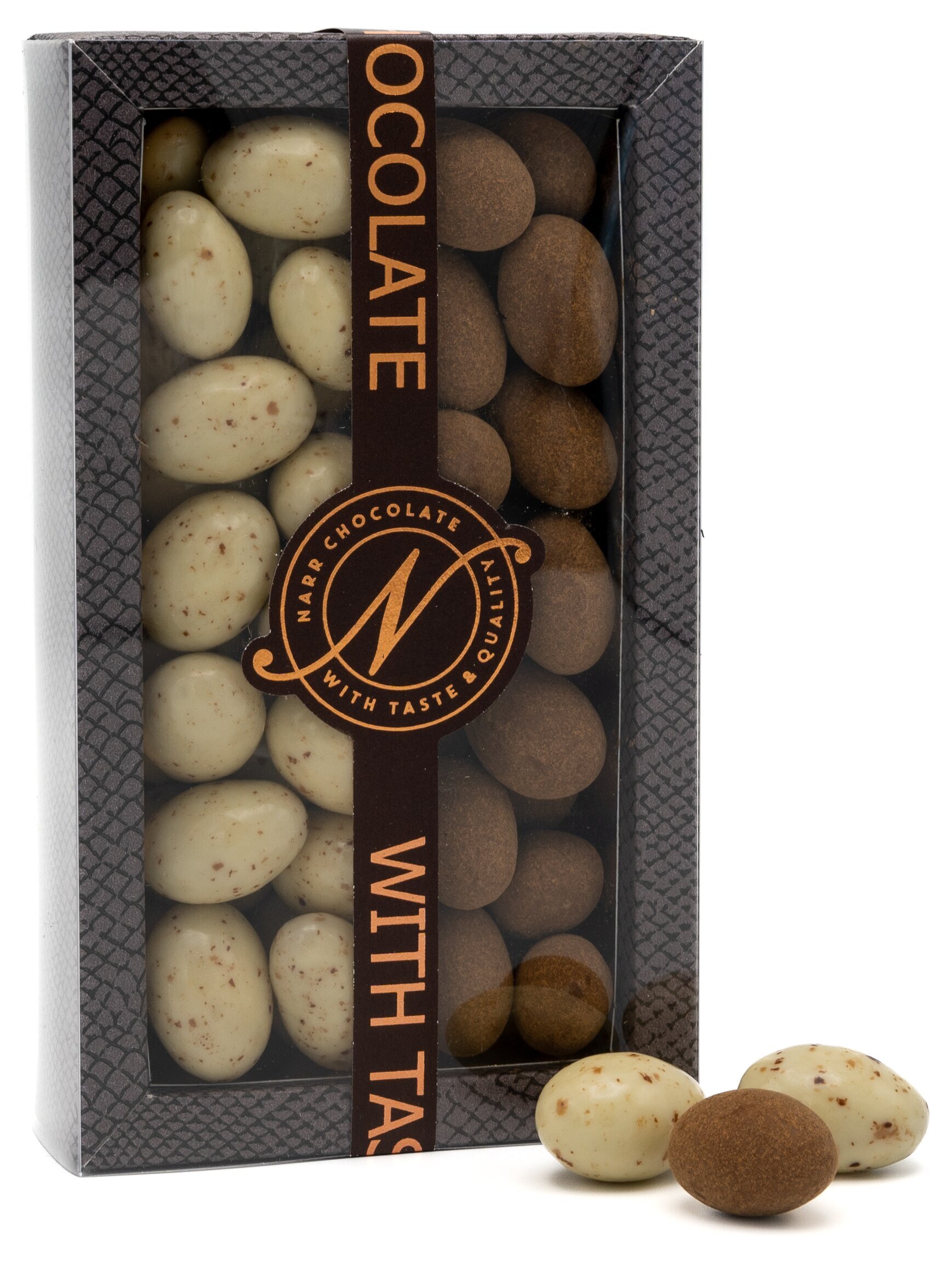 Mandlar dragerade med mjölkchoklad, vit choklad och med smak av kola arom.