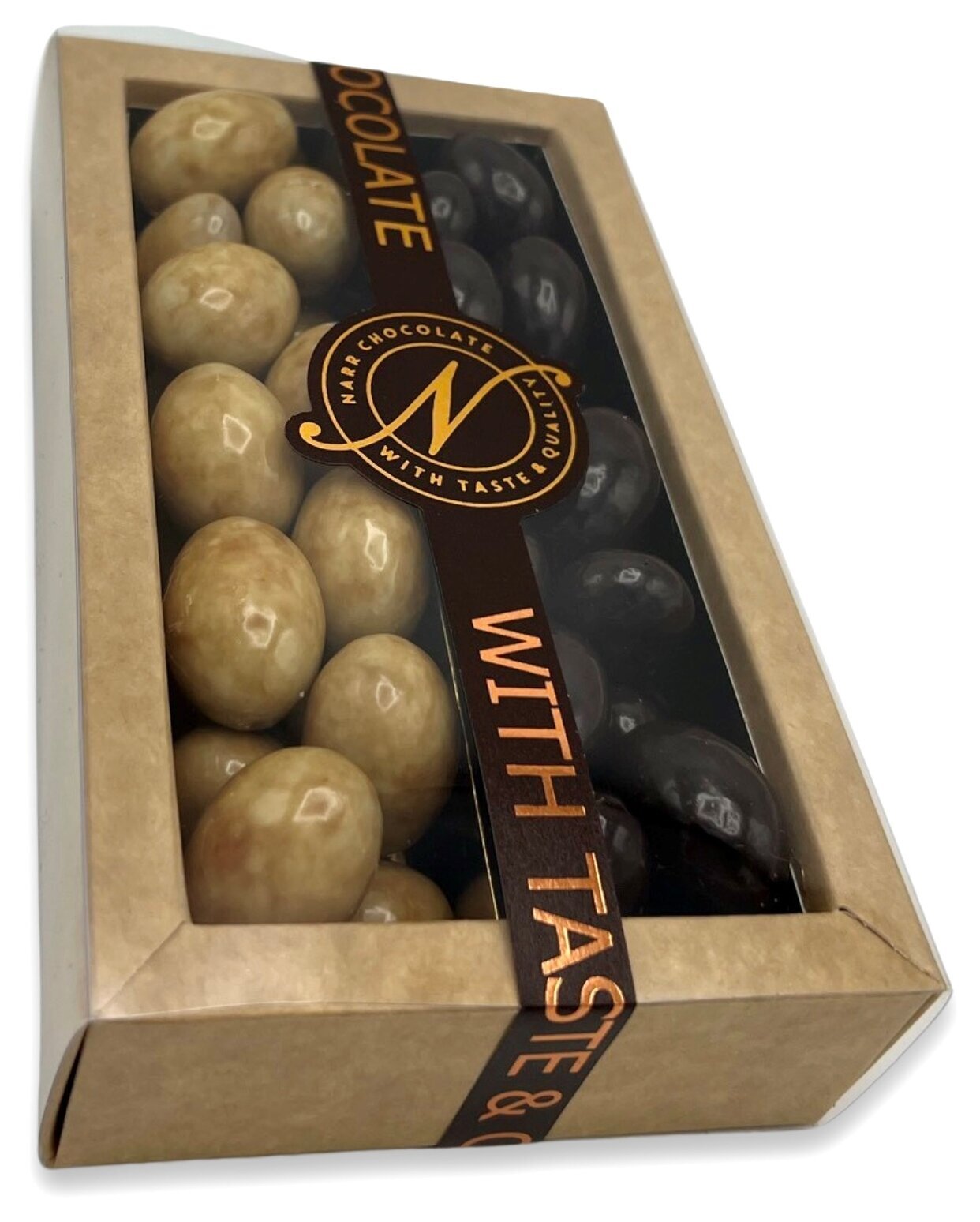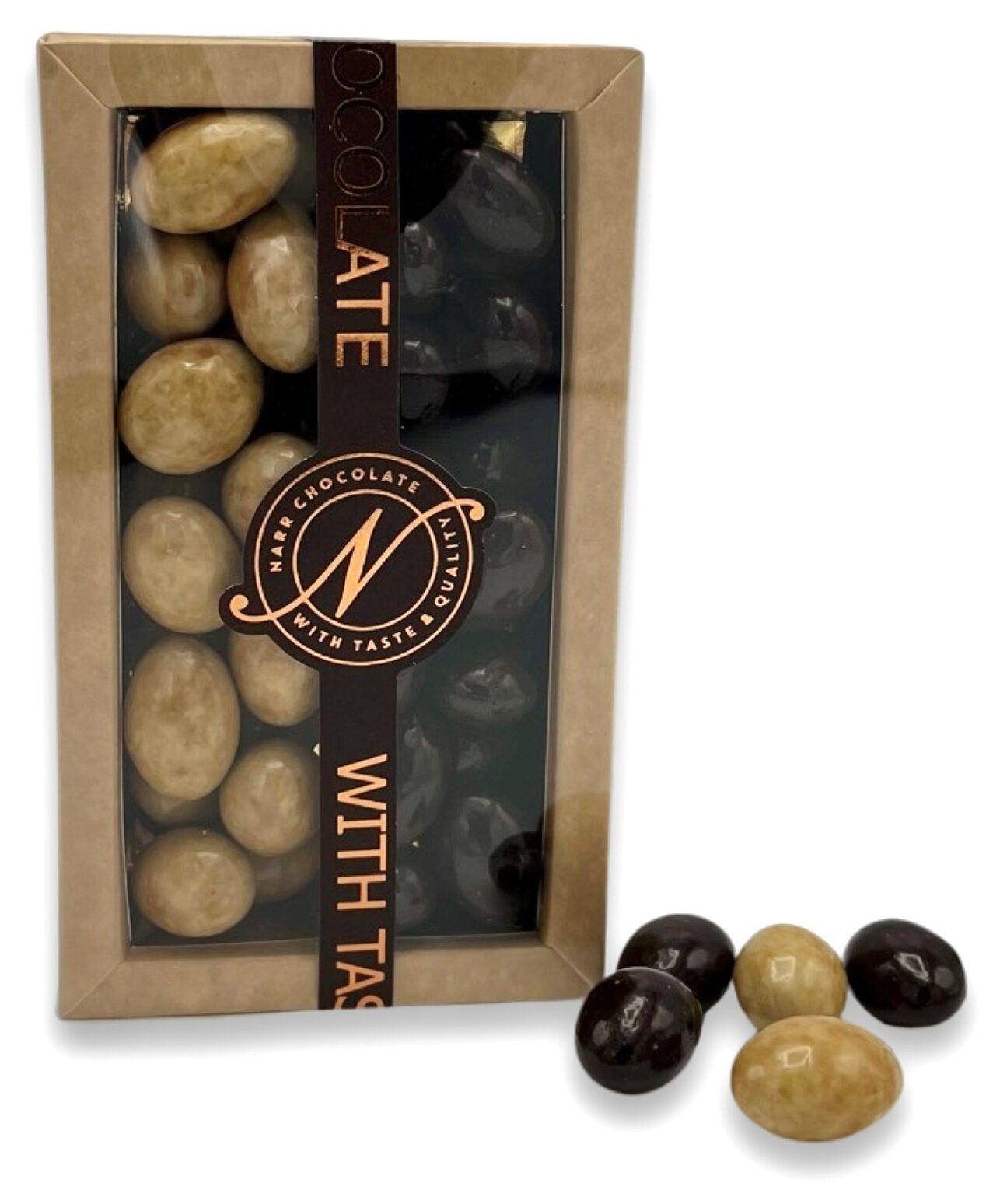 Mandlar dragerade med mjölkchoklad, vit choklad och smaksatt med tiramisu arom.