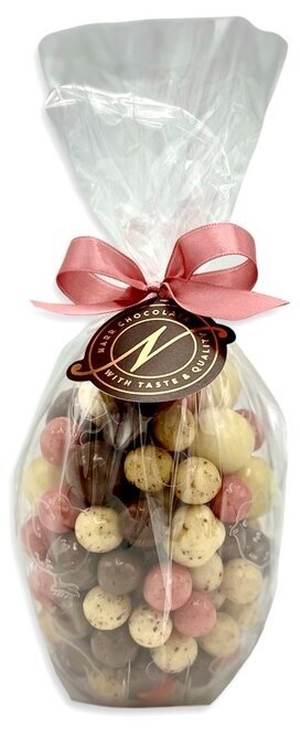 Plastförpackningen är noggrant stängd och dekorerad med ett dekorativt band i en rosa nyans. Bandet är knutet i en prydlig rosett, vilket adderar en känsla av en present, vilket förstärker produktens passande utformning för påskfirandet. På rosetten hänger en rund, brun etikett från Narr Chocolate, med företagets logotyp och slogan tryckt i ljusa bokstäver, vilket understryker produkternas fokus på smak och kvalitet.