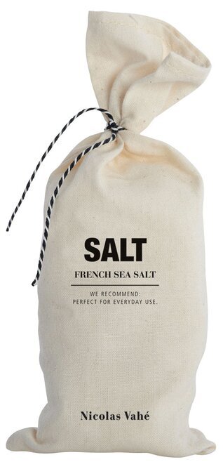 Bilden visar en naturlig och rustik förpackning från Köpstaden.se, där produkten French Salt In Bag 250 grm av Nicolas Vahé presenteras. Förpackningen består av en enkel tygpåse, vars strukturerade yta påminner om klassiskt linne eller canvas. Påsens textur ger en känsla av autenticitet och tidlöshet, som förstärks av dess neutrala, sandiga färgton.