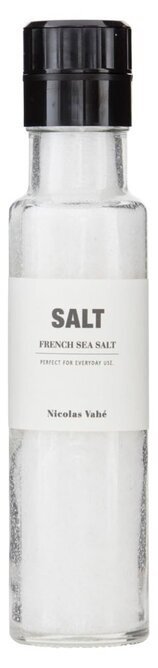 Bilden visar en elegant saltburk som finns tillgänglig hos Köpstaden.se. Produkten, som heter French Sea Salt, representerar Nicolas Vahés sortiment av högkvalitativa kryddor. Burken har en klar, cylindrisk form och är tillverkad av glas, vilket ger en tydlig vy över det vita, grova havssaltet inuti. Glasets transparens ger en genomskinlig effekt som lyfter fram produktens naturliga utseende.