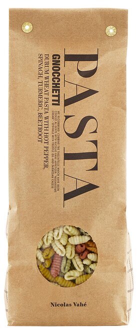 Bilden visar en stilfull förpackning av Pasta Gnocchetti från varumärket Nicolas Vahé, tillgänglig hos Köpstaden.se. Förpackningen är tillverkad av brunt papper, vilket ger en naturlig och jordnära känsla. Den rektangulära påsen står upprätt och har en enkel men smakfull design. Längst upp finns två mässingsfärgade nitar som förseglar förpackningen, vilket bidrar till en elegant och distinkt finish.