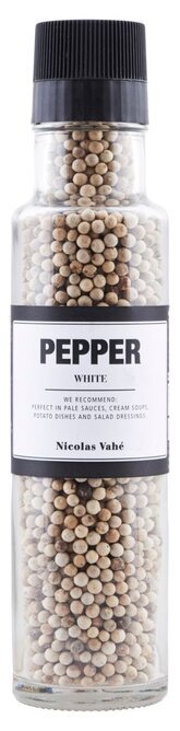 Utsökta och goda vitpepparkorn från Nicolas Vahé som har en kraftig, karakteristisk smak och en lätt arom. Gör goda såser med vitpeppar, eller använd den i lätta soppor, till potatisrätter eller en salladsdressing för att tillsätta lite extra smak. Pepparkornen som kommer i en smart och praktisk kvarn passar både på köksbänken samt matbordet. Öppnad flaska är hållbar i 16 månader.