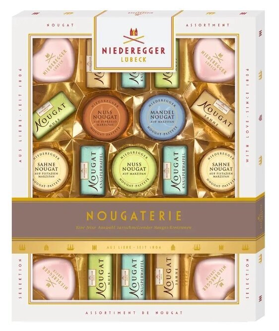 På bilden syns en presentförpackning med nougat från Niederegger, en produkt som finns hos Köpstaden.se. Förpackningen är avlång och har ett fönster av genomskinlig plast som visar innehållet i detalj. Asken är omsorgsfullt designad med en vit grund och gulddetaljer, där varumärkets namn Niederegger pryder ovandelen, tryckt i rött och guld på en bakgrund av vitt. Ovanför logotypen finns två små, korslagda kvistar i guldfärg, och undertill syns ortsnamnet Lübeck.