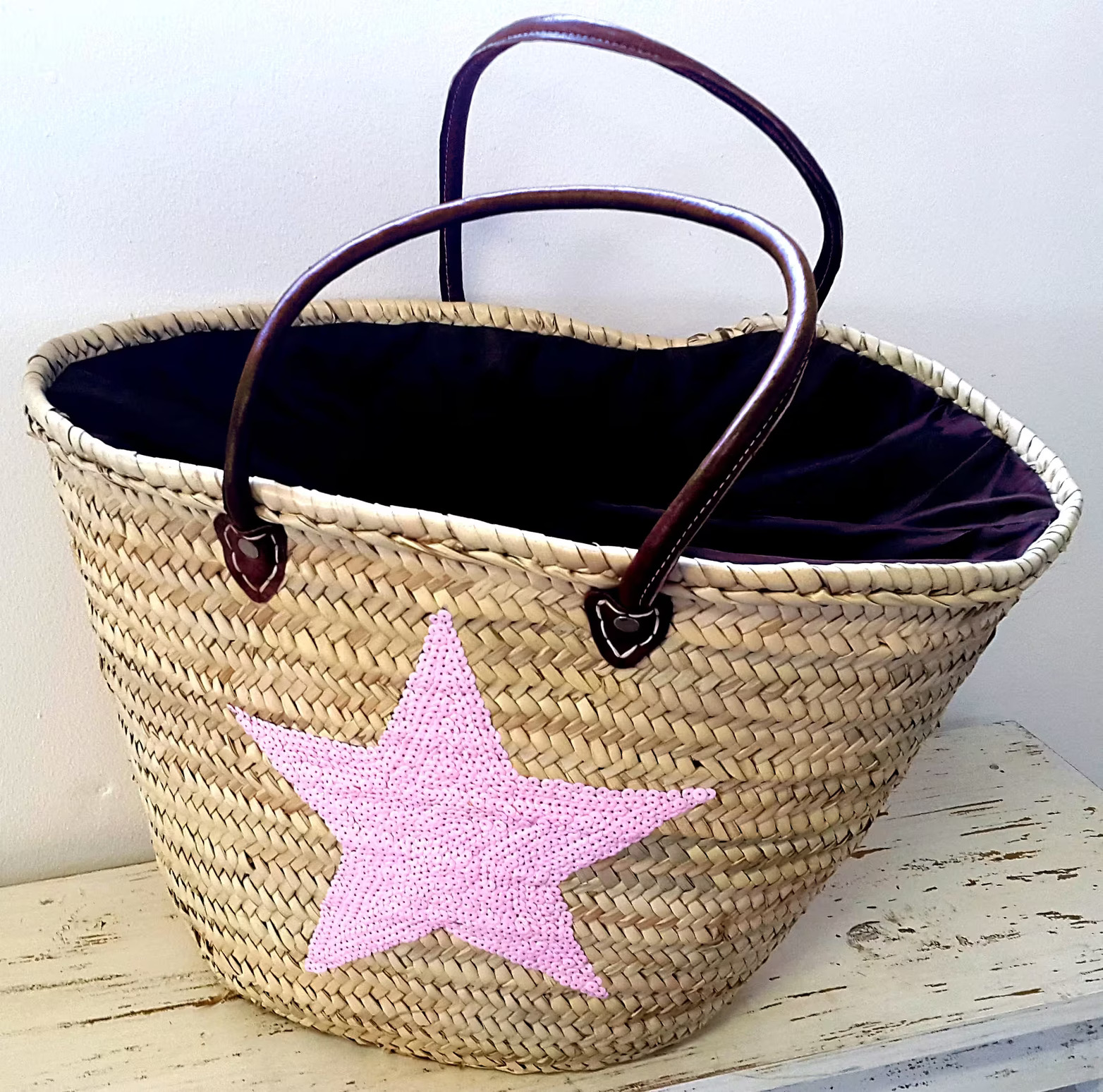 Bilden föreställer en stråväska från varumärket Nomadic Essentials, som finns tillgänglig hos Köpstaden.se. Väskan har en karakteristisk design med en stor dekorativ stjärna i rosa placerad på ena sidan. Denna stjärna, som är gjord av små, tätt packade paljetter, fångar blicken genom sitt blanka och iögonfallande utseende, vilket skapar en intressant kontrast mot den naturliga stråfärgen.