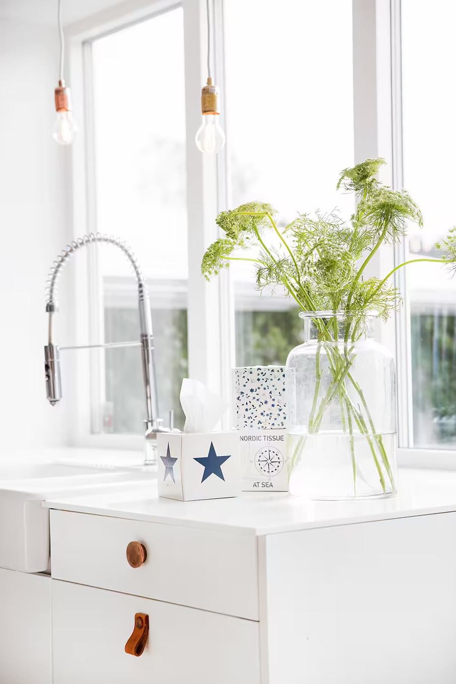 I bakgrunden syns ett fönster som sträcker sig från bänkens nivå upp till taket, släpper in ett generöst flöde av naturligt ljus och bjuder in till en öppen och luftig känsla. Detta förstärker det redan ljusa och inbjudande köket. Underifrån hänger två hängande glödlampor, som ger en antydan av industriell design och bryter det annars mjuka och homogena intrycket.