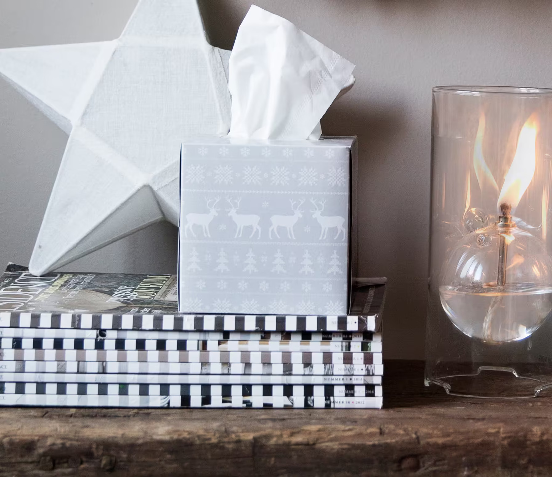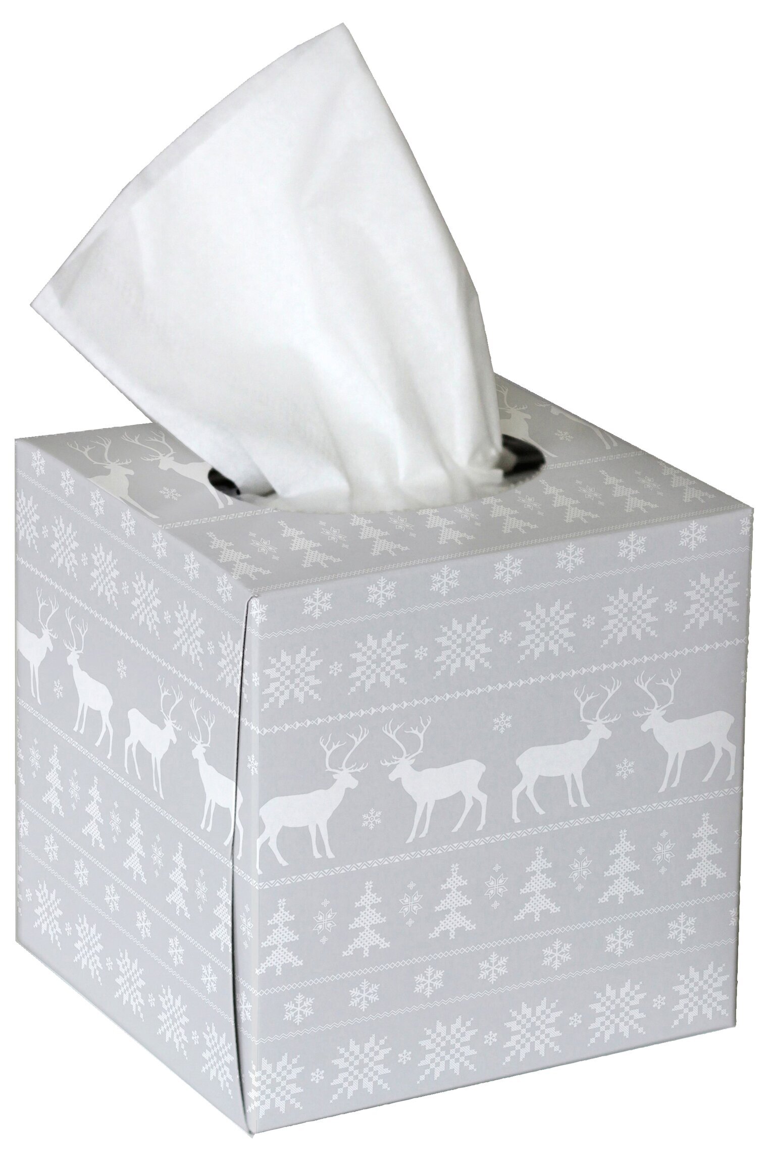 Snygg servettbox att låtas ha ståendes i köket, vardagsrummet, barnrummet, badrummet mm. Smidig att ha i husvagnen, båten eller sommarstugan. Servettboxen innehåller 100 stycken 2-lagers vita pappersnäsdukar som är FSC-cerifierade samt fria från klorin.