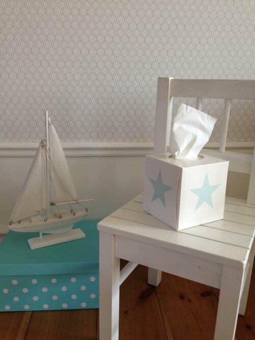 Bilden visar en charmigt arrangerad inredningsdetalj från Köpstaden.se, där den mångsidiga servettboxen STAR Turkos från Nordic Tissue spelar huvudrollen. Denna box är kubformad och pryds av ljusblå stjärnor på sidorna, vilket ger ett lekfullt och samtidigt stilrent intryck. Servettboxen är placerad på en vitmålad trästol, vars enkelhet i designen förstärker servettboxens dekoration och färger.
