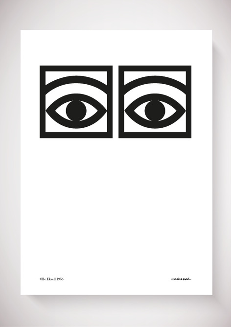 Bilden visar en enkel men effektfull affisch från varumärket Olle Eksell, tillgänglig hos Köpstaden.se. På bilden syns två stiliserade ögon placerade bredvid varandra, som om de betraktar betraktaren. Dessa ögon är svarta och inramade av rektangulära konturer i samma färg, vilket skapar en känsla av balans och symmetri.