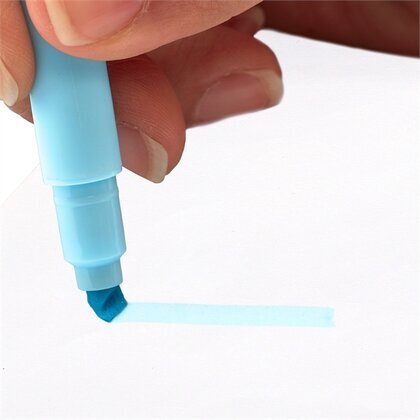 Den ljusblå highlightern används för att dra ett jämnt och tydligt streck över ett vitt papper. Det blå strecket framhävs starkt mot det vita bakgrundsmaterialet, vilket gör att ögat naturligt dras till kontrasten och den lilla delen av färg som tillförs till pappret. Den spetsiga änden av highlightern är skarp och tydligt definierad, vilket underlättar noggrann markeringsarbete.