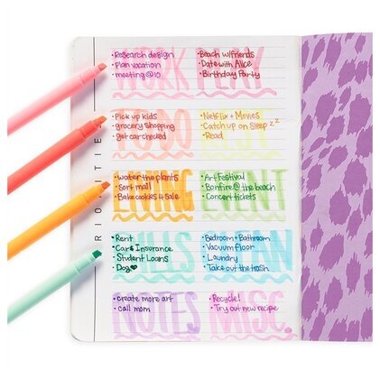 Till höger finns en dekorativ, mönstrad sida med ett säregent, lila leopardtryck som kontrasterar vackert med de pastellfärgade markeringarna. Denna sida ger en extra touch av stil och personlighet till anteckningsboken.