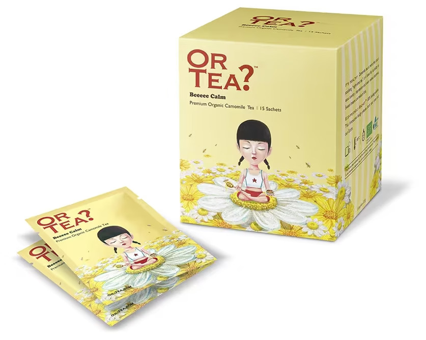 Texten "Or Tea" är placerad upptill i ett markant rött typsnitt, och precis under det står produktens namn Beeeee Calm. Ytterligare information på kartongen inkluderar att detta är ett premium ekologiskt kamomillte, och att förpackningen innehåller 15 påsar. Dessa detaljer är skrivna med mindre, tydlig text som gör det enkelt för konsumenten att förstå innehållets kvalitet och kvantitet.
