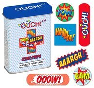 Bilden visar en färgglad produkt från Köpstaden.se, en butik som erbjuder ett brett sortiment för alla dina vardagsbehov. Produkterna i bilden tillhör varumärket Ouch! och specifikt serien kallad Comic Strips. Centralt i bildens fokus finns en metallisk ask prydd med grälla färger och text. Asken har en övre del i blått med varumärkets namn tydligt tryckt i vitt, vilket ger den en iögonfallande kontrast.