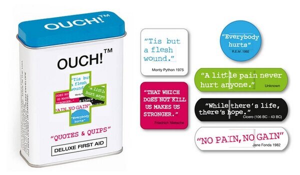Bilden från Köpstaden.se visar en mångsidig produkt från varumärket Ouch! som heter Quotes & Quips. Produkten utgörs av ett metalliskt första hjälpen-kit, prydligt dekorerat med färgrika citat. Framsidan av lådan är dominerad av namnet Ouch! i svart, vilket står ut mot den vita bakgrunden. Längre ner på lådan syns ordet Quotes & Quips i rosa, följt av texten Deluxe First Aid, vilket antyder att detta kit kanske innehåller mer än bara vanliga plåster och bandage.