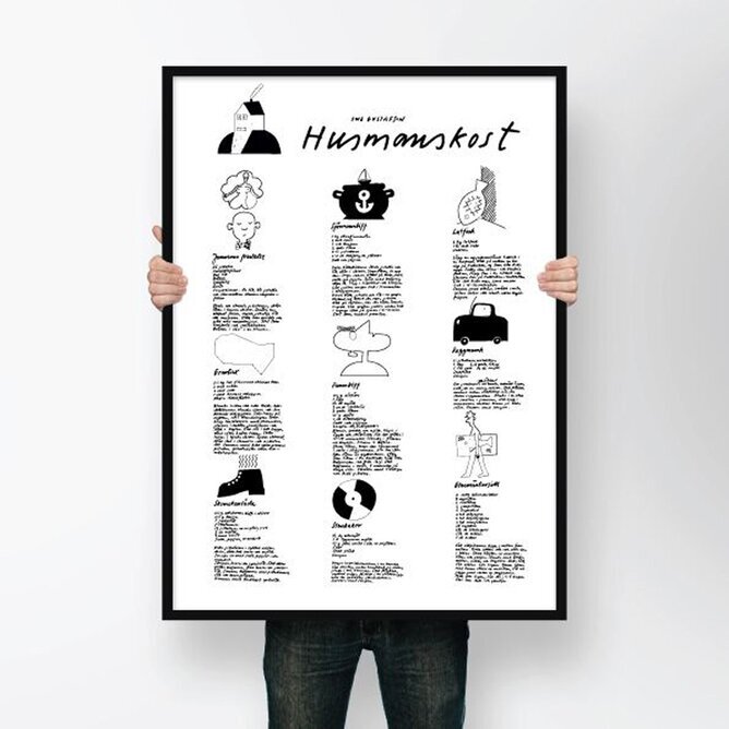 Bilden föreställer en affisch som hålls upp av en person, där affischens innehåll tar upp större delen av det synliga området. Affischen som visas här är från produkten Poster Husmanskost #1, och den är skapad av varumärket Owe Gustafson. Den finns tillgänglig i den mångsidiga butiken Köpstaden.se, som erbjuder ett brett urval för alla vardagliga behov.