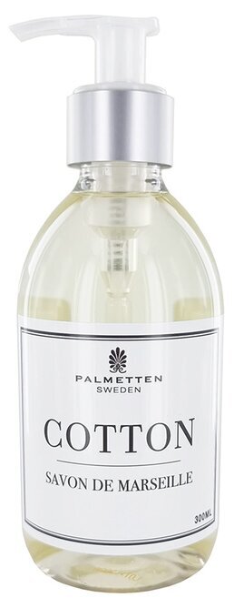 Etiketten på flaskan är vit med en enkel, svart typografi som ger ett intryck av renhet och kvalitet. Det står tydligt Palmetten Sweden högst upp, följt av namnet på produkten: Cotton Savon de Marseille. Denna klassiska stil på etiketten lyfter fram ursprunget och traditionen bakom den flytande tvålen, vilket är en av de olika produkter man kan hitta på Köpstaden.se.