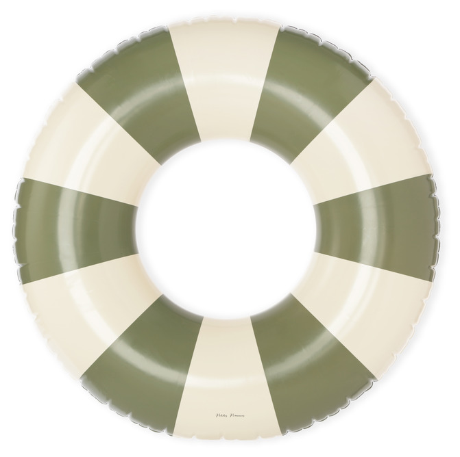 På bilden visas en badring från Köpstaden.se, där produkten benämns som Badring Terra Verde - Petites Pommes. Badringen har ett karakteristiskt randigt mönster, där två färgnyanser dominerar designen. Det växlande mönstret av olivgrönt och en subtil creamfärgad ton skapar en visuell kontrast som fångar blicken. Färgerna påminner om naturens jordiga palett, vilket ger en harmonisk känsla som passar utmärkt till varumärket Petites Pommes som erbjuder en rad kvalitativa produkter.