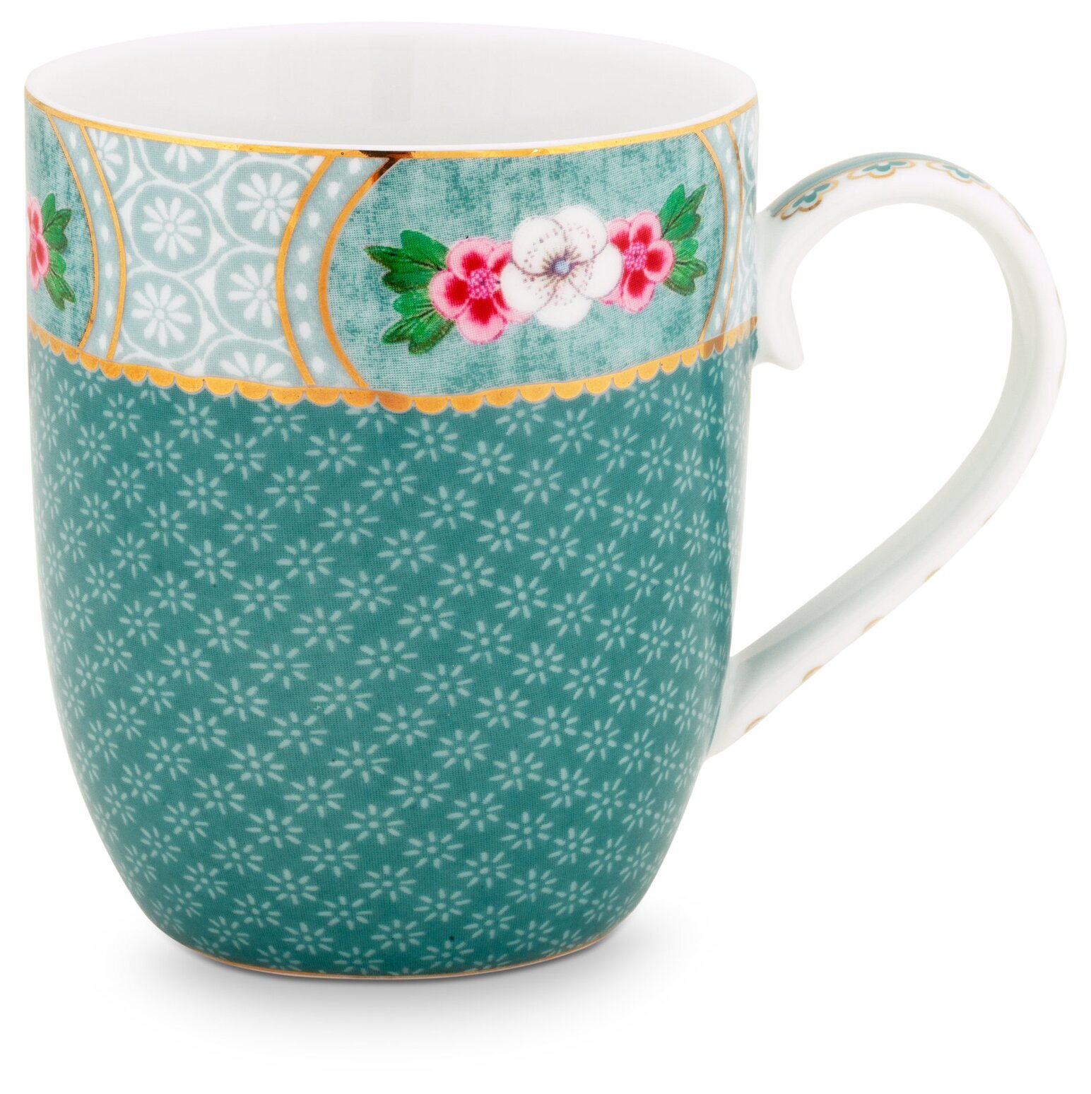 Vacker porslinsmugg dekorerad med rosa/vita blommor och gulddekor från PiP Studio.