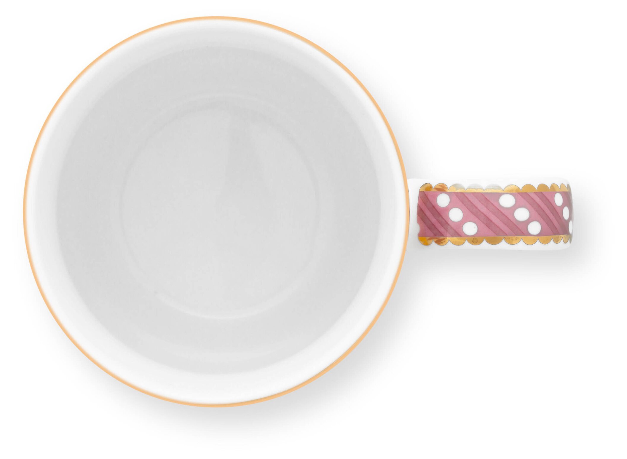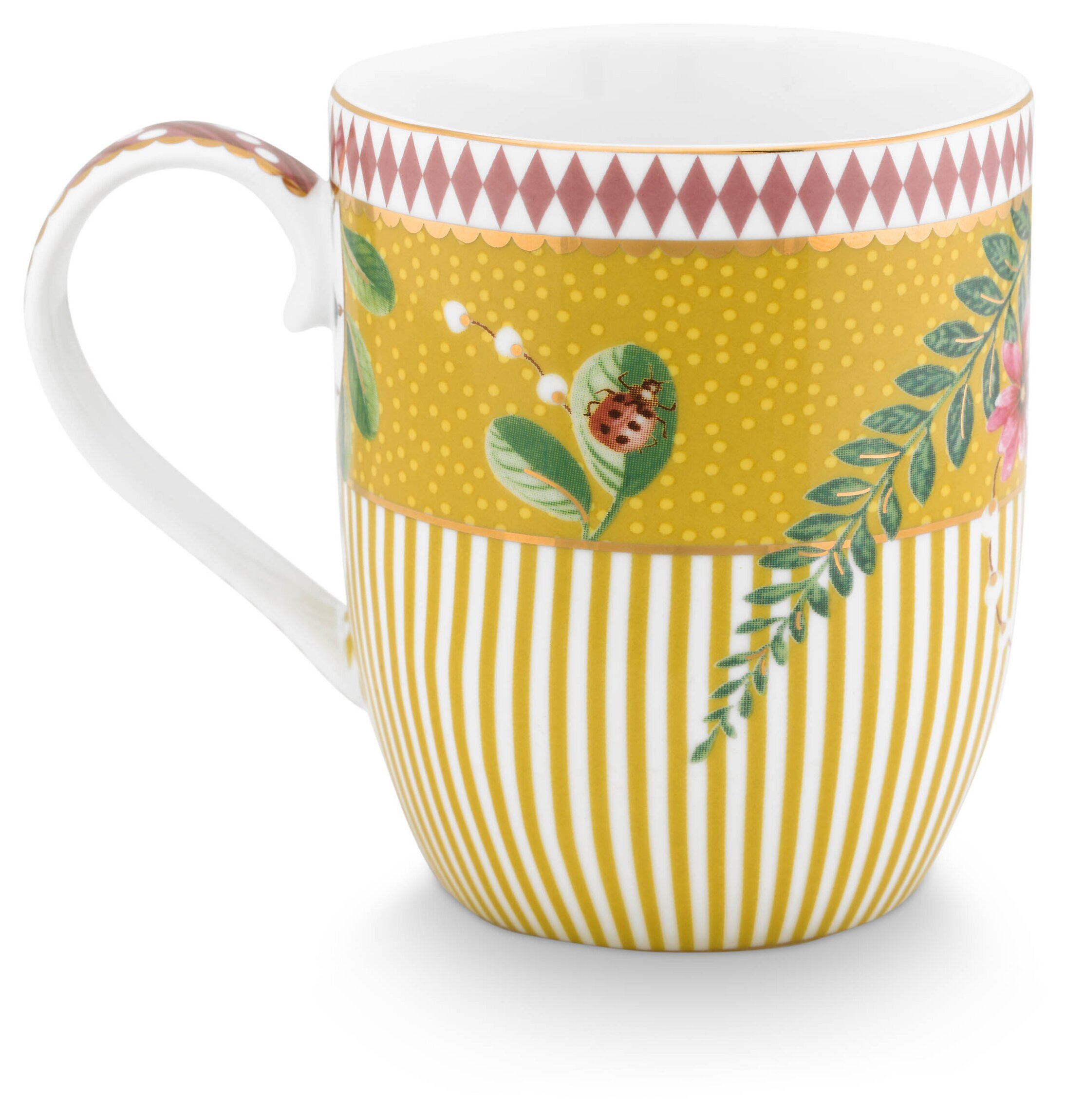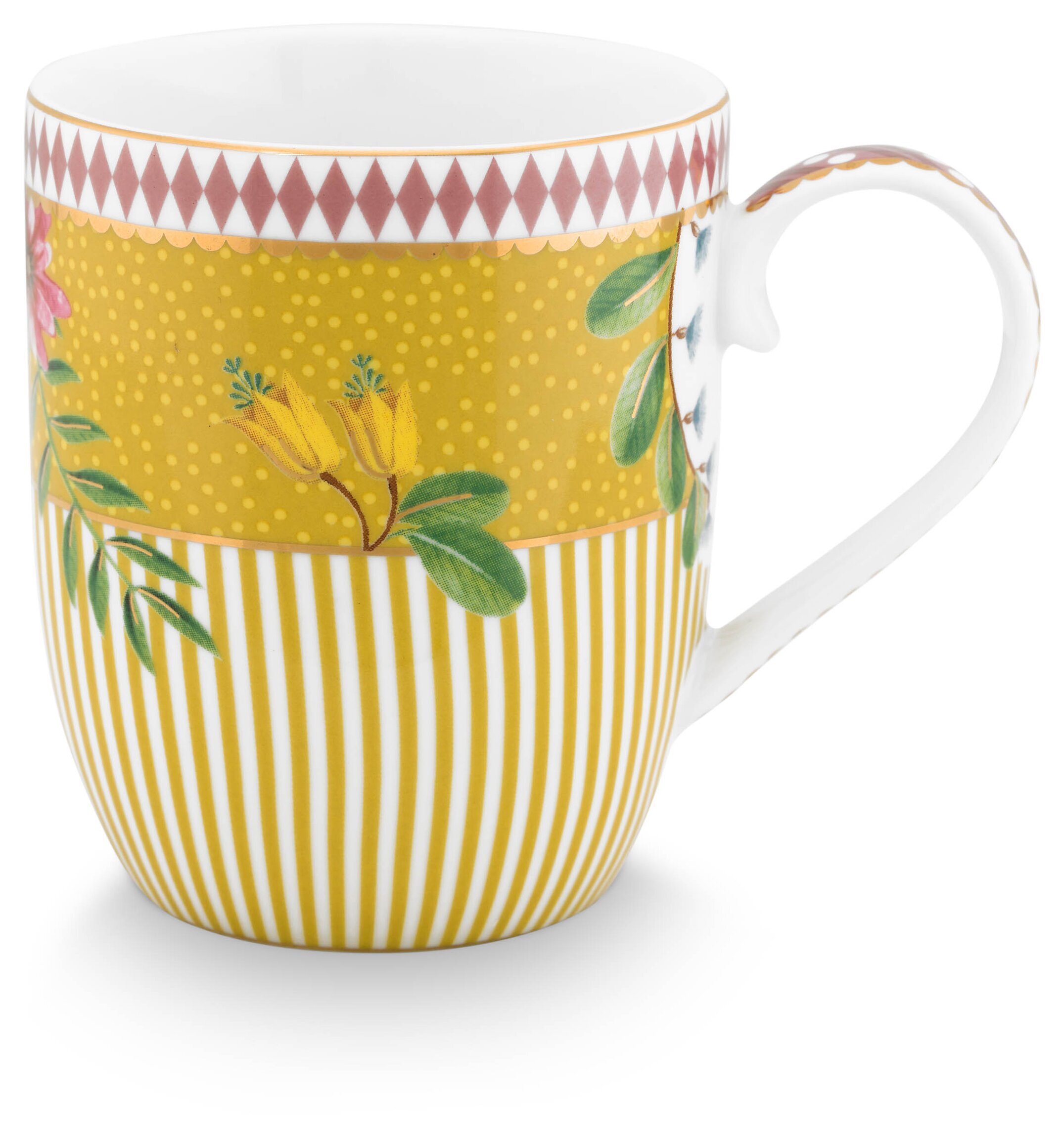 Vacker porslinsmugg dekorerad med blommor, blad och gulddekor från PiP Studio.