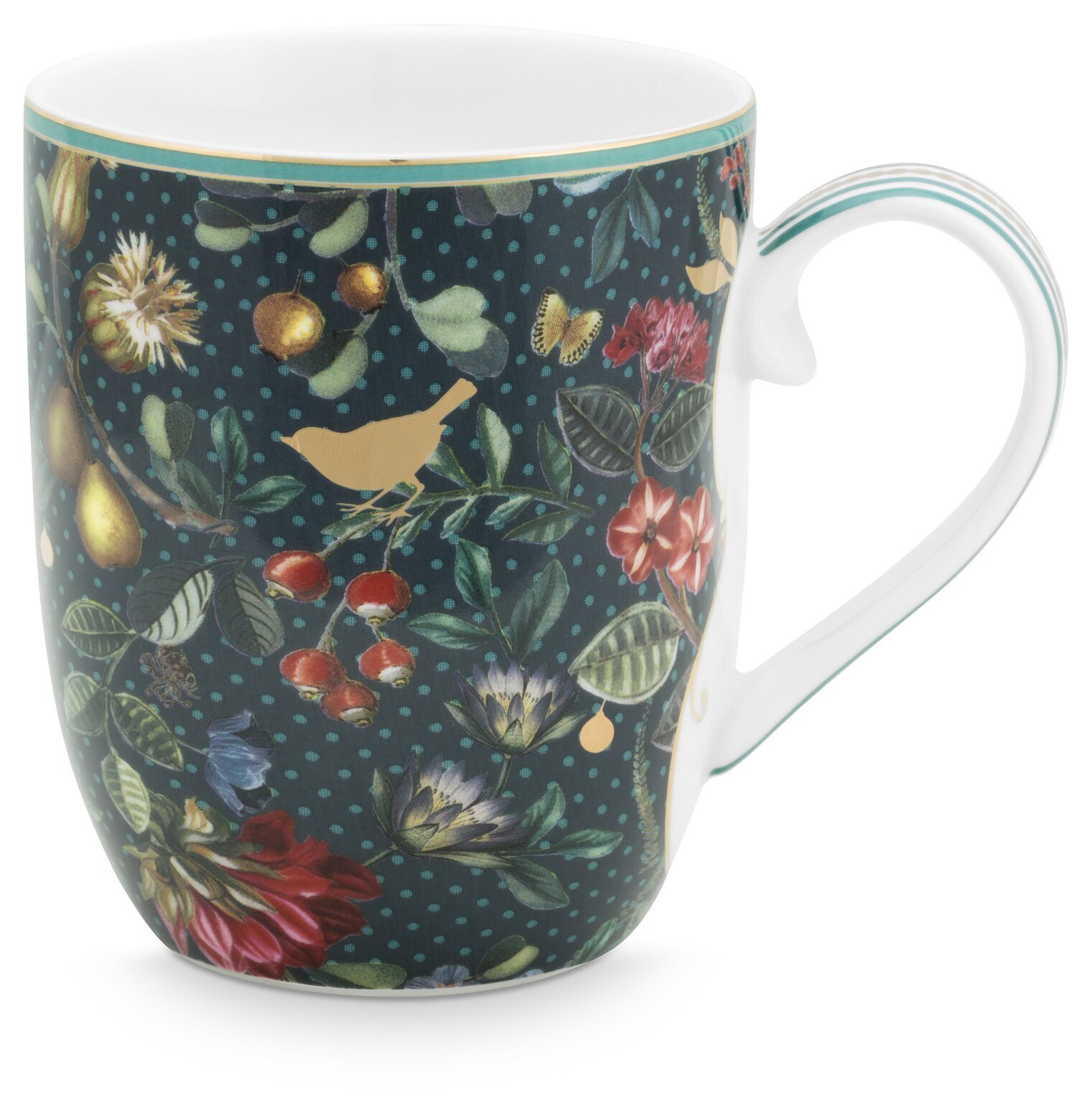 Vacker porslinsmugg dekorerad med blommor, blad och gulddekor från PiP Studio.