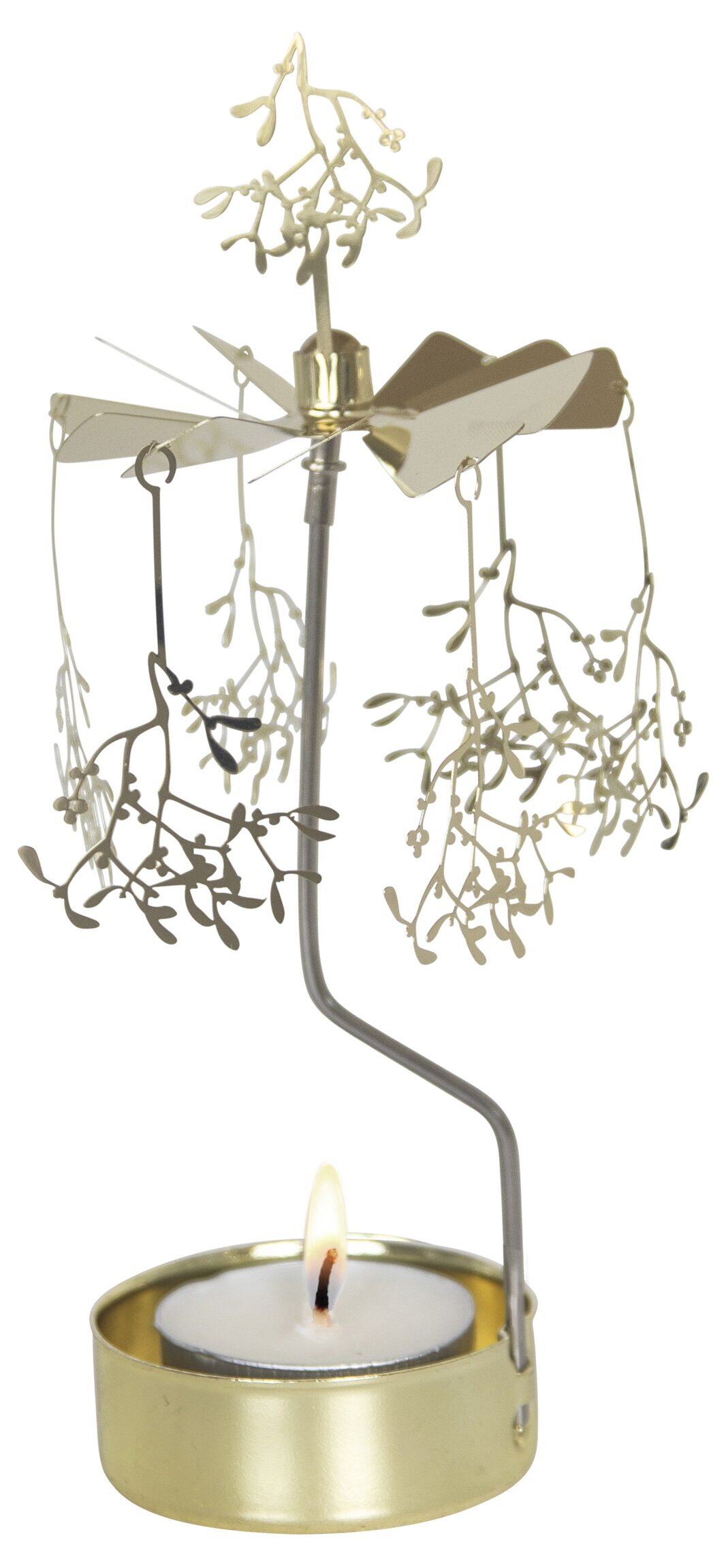 Nedtill i bildens framkant syns en tänd värmeljushållare, vars ljusflamma bidrar till den varma och inbjudande atmosfären. Ljuset från lågan reflekteras försiktigt mot metallens yta, vilket skapar ett spel av skimrande ljus och skuggor. Det får de hängande mistelkvistarna att dansa lätt under propellerns rörelse detta mönster av ljus och rörelse är kärnan i produktens funktion.