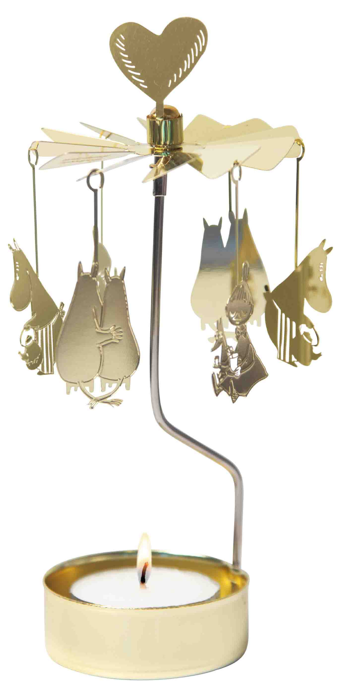 Figurerna svävar elegant runt om kretsen när spelet är i rörelse, vilket skapas av det värmeljus som placerats i den runda hållaren längst ner. Ljuset reflekteras genom de polerade metallytorna, vilket skapar ett mjukt och behagligt sken som förstärker de snirkliga konturerna hos varje hängande figur. Rörelsen och ljuset skapar en rogivande atmosfär, perfekt för mysiga kvällar eller stunder av kontemplation.