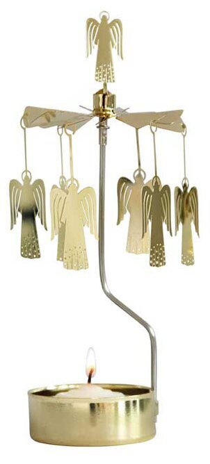 I centrum av konstruktionen står en smal och elegant stång som bär upp den roterande plattformen där änglarna är fästa. Denna plattform vilar ovanför en enkel men funktionell ljushållare i samma gyllene nyans. Ljushållaren är designad för ett vanligt värmeljus vars flamma driver hela mekanismen. När ljuset är tänt genererar värmen en mjuk och tyst rotation, vilket får änglarna att långsamt cirkulera i en gracefull dans.