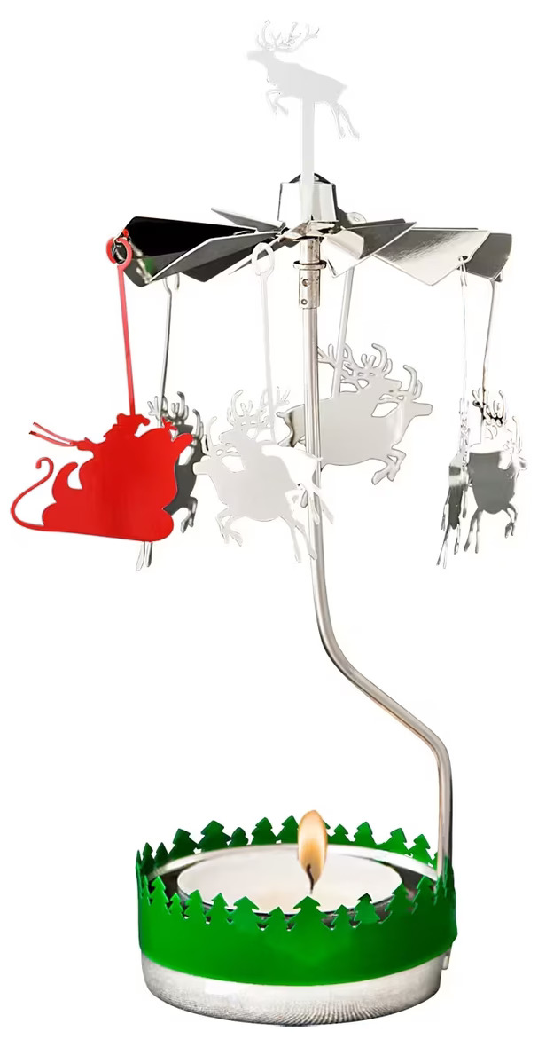 Bilden visar en dekorativ produkt från Köpstaden.se under varumärket Pluto Produkter, kallad Änglaspel Tomte/Renar. Denna ornamentala kreation framhäver en känsla av julstämning och tradition med sitt unika roterande system.