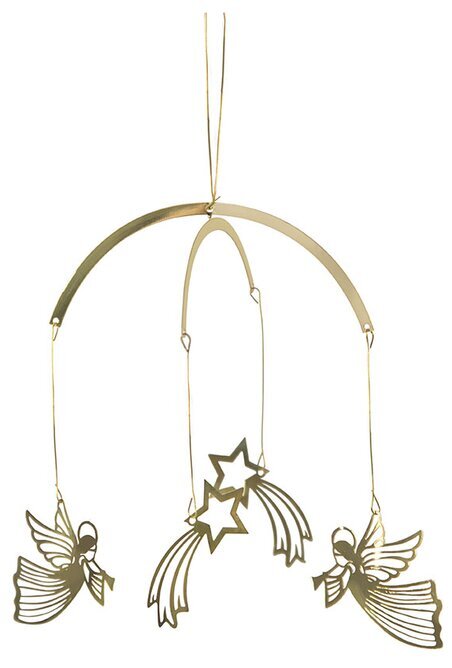 Mobilens struktur hålls samman av en bågformad ram, även den i samma guldfärgade material. Ramen formar en mjuk kurva och ansluter till varje figur med tunna, nästan osynliga trådar som ger intrycket av att änglarna och stjärnorna svävar fritt i luften. Den övergripande konstruktionen är både stabil och stilren, vilket möjliggör rörelse och dynamik i alla delar.